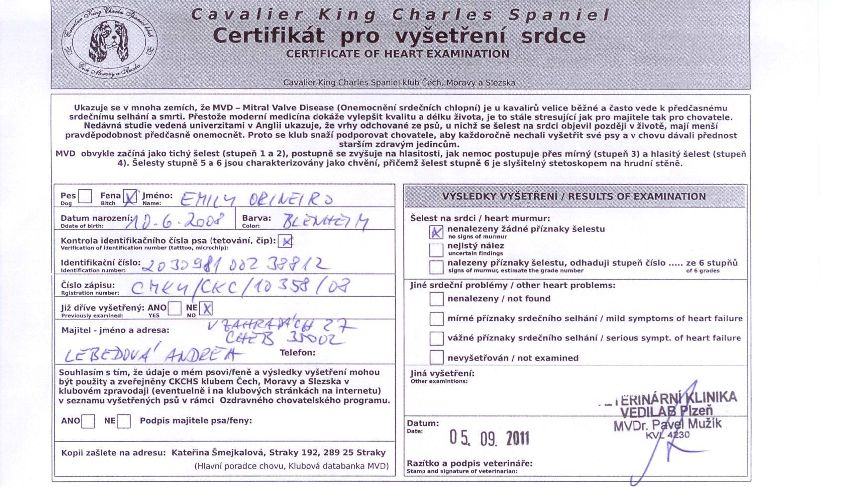 Jelikož je u kavalírků známo při špatném způsobu chovu a vlivem dědičnosti kromě jiných, také degenerativní onemocnění mitrálních chlopní, docházela jsem s naší Emilly pravidelně každým rokem na poslechové vyšetření srdíčka, která má doposud /únor 2013/ bez známek šelestu.